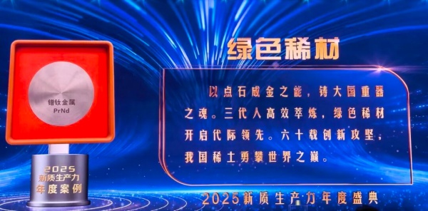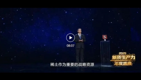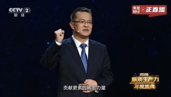 1月26日,中央广播电视总台“2025新质生产力年度盛典”播出。盛典现场重磅发布10个“2025新质生产力年度案例”,北方稀土以突破性创新实力成功入选,是稀土行业唯一入选企业。北方稀土党委副书记、总经理瞿业栋代表企业分享新质生产力案例实践。